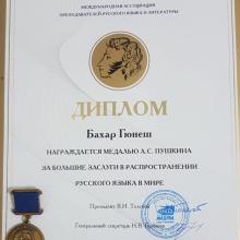 Yabancı Diller Fakültesi Rusça Mütercim ve Tercümanlık Anabilim Dalı Başkanı Prof. Dr. Bahar GÜNEŞ, Uluslararası Rus Dili ve Edebiyatı Öğretmenleri Derneği (MAPRYAL) tarafından 1977 yılından itibaren Rus dilini yaygınlaştırılmasında ve gelişmesinde katkı gösteren bilim insanlarına verilen A.S.Puşkin madalyasını almaya hak kazanmıştır. Türkiye’de ilk defa Prof. Dr. Bahar GÜNEŞ’e verilen ve dünya çapında prestijli bir ödül olan A.S.Puşkin madalyası Rus dilinin, Rus edebiyatının ve kültürünün yabancı ülkelerde yayılmasına önemli katkılarda bulunan Rus ve yabancı bilim insanlarına, uzmanlara ve öğretmenlere verilmektedir. Toplam 71 ülkede 411 bilim insanına verilen ödül Rusya Federasyonu dahilinde eğitim alanında en önemli ödüllerden birisi sayılmaktadır. Rusça Mütercim ve Tercümanlık Anabilim Dalı olarak Hocamızı tebrik eder, başarılarının devamını dileriz.